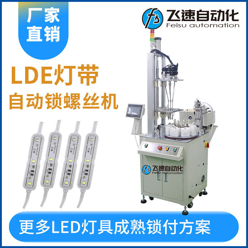 led燈帶是指把LED組裝在帶狀的柔性線路板或PCB硬板上,產(chǎn)品形狀象一條帶子又非常節(jié)能和綠色環(huán)保,用于各個行業(yè)中的裝飾,LED燈帶的使用也越來越普及,也因為使用壽命長(一般正常壽命在8~10萬小時),所以在市場上需求也比較大。 LED燈帶是采用FPC做組裝線路板,生產(chǎn)組裝過程中都需要對燈具貼片和各個工件進行螺絲緊鎖加工,在傳統(tǒng)的生產(chǎn)線上,技術工人需要對不同型號的燈具體分別進行螺絲鎖緊加工操作,雖然也應用了自動機器人之類的自動設備,但是傳統(tǒng)生產(chǎn)線的自動化水平還比較低,不能適用于不同型號的燈具加工,設備的自動化水平還需提高。 本案例應用于LED燈帶自動化生產(chǎn)線的自動鎖螺絲機,主要目的在于解決生產(chǎn)中的不足和缺點,設計一臺自動化燈具生產(chǎn)螺絲設備,它不僅可以對燈具進行自動化地組裝、鎖緊加工操作,而且可以適用于不同型號、規(guī)格、大小的燈具體,設備的自動化水平比較高。 該設備根據(jù)產(chǎn)品進行設計多工位轉(zhuǎn)盤式螺絲機,通過在轉(zhuǎn)盤式安放多個工位實現(xiàn)多工序同步作業(yè),主要是為了實現(xiàn)擰螺絲和取放產(chǎn)品同步完成,作業(yè)員不停放置產(chǎn)品,設備不停擰螺絲,增強了人機協(xié)作,較大幅度提升效率,減輕人工勞動強度。