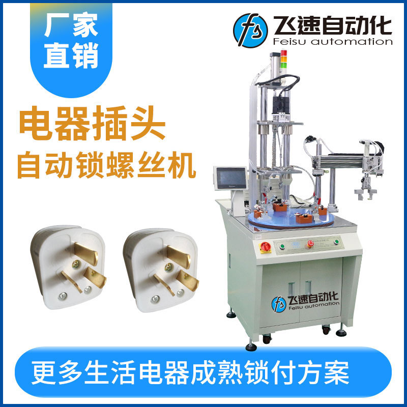 電源插頭作為一種日常用品,在生活中被廣泛使用。因此它的使用安全性也越來越引起人們的重視。現(xiàn)在常用的電源插頭由于為了便于插腳能順利的插入到插座的插孔中,一般是插座的插孔的內(nèi)徑大于插腳的外徑并且插孔的絕緣上蓋上設(shè)置有倒角。但是這種結(jié)構(gòu)也帶來了安全隱患。因?yàn)樵诓蹇椎慕^緣上蓋處,插腳與插孔的內(nèi)壁之間存在著一定的縫隙,在插頭的插拔過程中,很容易從縫隙中帶入雜質(zhì),引起短路,更危險的是,小孩有可能將手指伸入到縫隙中,有著觸電的危險,在生產(chǎn)中需要螺絲來緊固內(nèi)部的螺絲,傳統(tǒng)手工放置螺絲和對準(zhǔn)螺絲頭部仍需要占用大量的工作時間和精力,因此整體效率提升比較低,有而且很容易滑牙擰不緊等問題造成產(chǎn)品質(zhì)量差,廠家會考慮到電動螺絲刀或者氣動螺絲刀擰緊兩種,后者通過電動或者氣動的方式產(chǎn)生旋轉(zhuǎn)動力,以代替頻繁手工的擰緊動作,雖然在生產(chǎn)上堅強(qiáng)了勞動的強(qiáng)度,但仍然存在生產(chǎn)效率得不到提升。 飛速自動化提供一臺機(jī)械手轉(zhuǎn)盤式自動擰螺絲機(jī)通過配置轉(zhuǎn)臺和機(jī)械手臂,由設(shè)備一次擰好多顆螺絲,擰好螺絲的產(chǎn)品由機(jī)械手臂抓起并放入流水線,設(shè)備可實(shí)現(xiàn)多軸擰螺絲、取放產(chǎn)品 、送螺 絲、員工放置工件等多工位同步圓周作業(yè),生產(chǎn)效率極高。 機(jī)械手轉(zhuǎn)盤式擰螺絲機(jī)詳細(xì)介紹 省人工,流水線專用,配置機(jī)械手和轉(zhuǎn)盤,實(shí)現(xiàn)供料、檢測、鎖付、取放產(chǎn)品同步作業(yè),并由設(shè)備自動完成,節(jié)省大量人工; 效率高,多把電批同時工作,可代替多名工人。電批數(shù)量可根據(jù)客戶要求定制; 易操作,傳統(tǒng)的手工取螺絲和對準(zhǔn)螺絲孔需要占用大量的工作時間和精力,只需不停放置工件; 智能化,PLC智能電路控制.配置觸摸屏,操作簡單,員工只需放置工件即可; 高標(biāo)準(zhǔn),鎖付工序完全由設(shè)備按程序自行完成,避免人工誤操作帶來的不良影響; 性能穩(wěn),關(guān)鍵部位采用高品質(zhì)五金材料并經(jīng)過特殊處理,電子原器件采用原裝進(jìn)口。